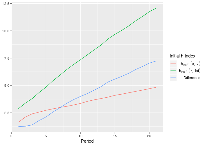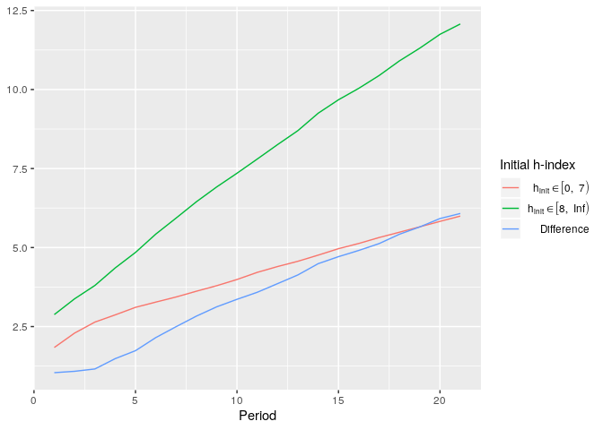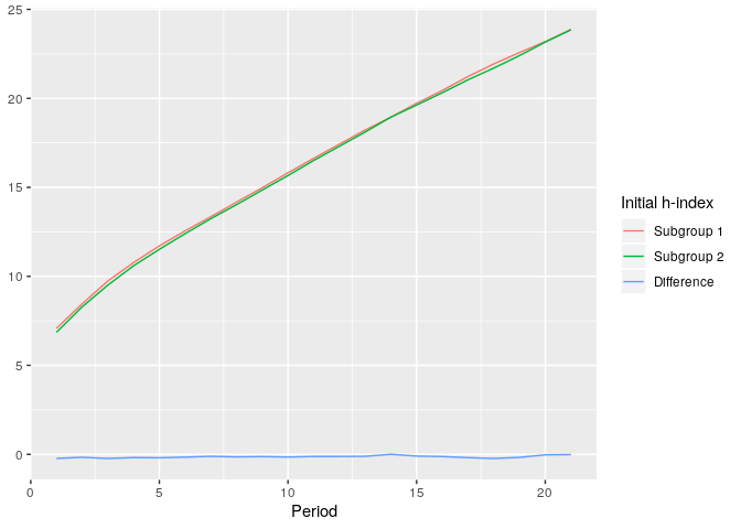 simdata <- simulate_hindex(runs = 5, n = 200, periods = 20, subgroups_distr = .5, coauthors = 3, distr_initial_papers = 'poisson', dpapers_pois_lambda = 10, distr_citations = 'poisson', dcitations_mean = 5, dcitations_peak = 3, alpha_share = .33)