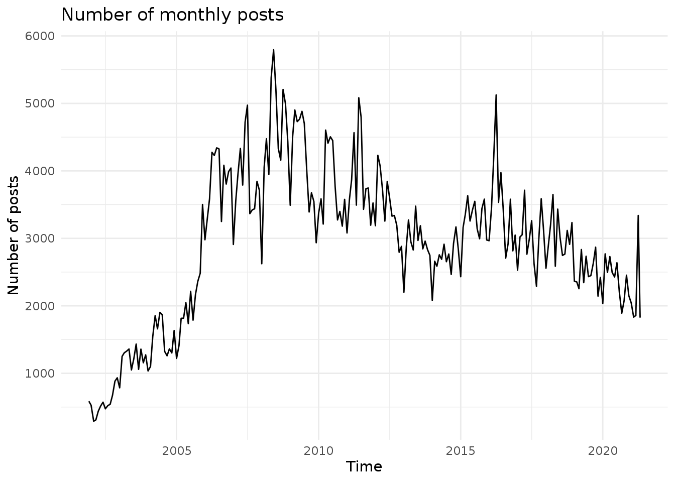theme_minimal() + ylab("Number of posts") + xlab("Time") + ggtitle("Number of monthly posts")
