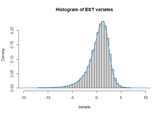 hist(sample,breaks = 150,freq = FALSE,xlim = c(-15,10),main = "Histogram of EST variates")